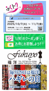 トピック10月29日は💝ふくようハギレの日💝2025年10月25日Yozo10月29日(水)は ふくよう「ハギレの日」‼️‼️毎月29(フク)日は、福洋(フクよう)「ハギレの日」😸10月は29日(水)に開催します今回は秋冬高級着分生地の『ハギレ』🌟も大ご奉仕!👍秋冬物も揃ってます🌠ふくトクLINEクーポン💛配布中(!)<福洋では5,000円以上お買い上げで1,000円引👍>利用期間は11/7(金)まで発行数には限りがありますので、お早めに(レジ前にて配布しています)この機会にぜひご来店くださいませ